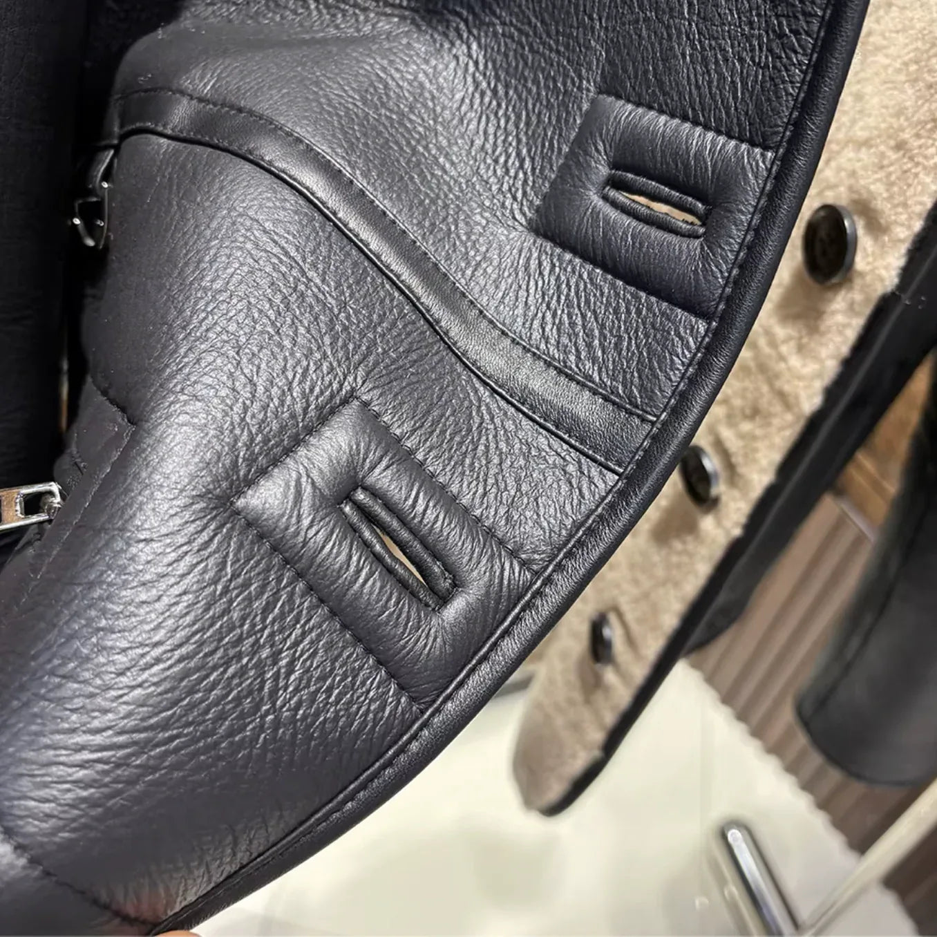 - Inside lined with dense beige lamb wool, reversible for two styling options: leather-out for polish, shearling-out for warmth.