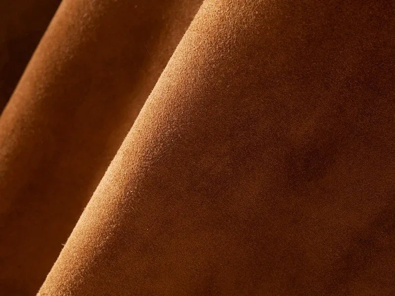 • Premium genuine sheepskin suede exterior with a soft matte texture, matching the warm brown finish shown in the close-up suede shots.