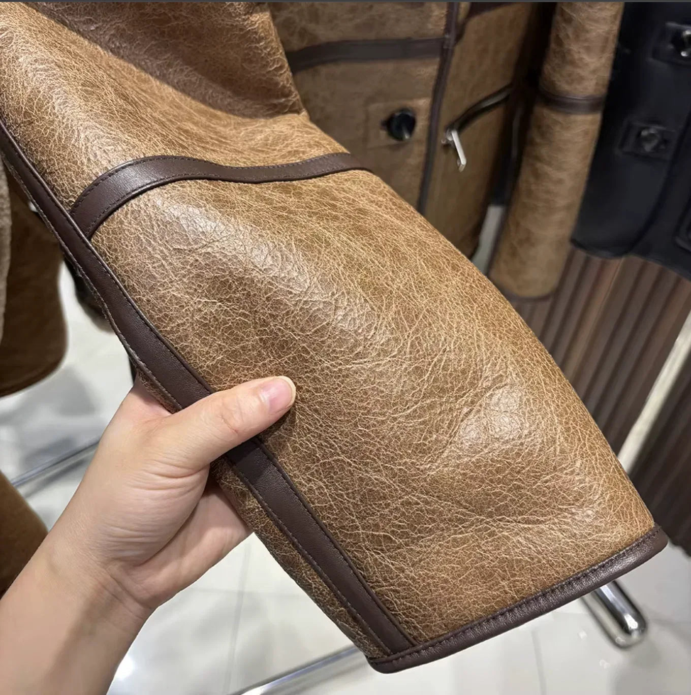 The women’s shearling leather jacket brown brings together genuine sheepskin leather and plush lamb wool to create a reversible winter essential. Its naturally weather-resistant brown leather exterior contrasts with a warm beige shearling interior that feels soft against the skin. Designed with a relaxed bomber silhouette, structured collar, and secure button closure, it adapts easily to cold city days or countryside weekends. Each panel is precision-stitched with tonal trim to preserve shape and strength. This shearling leather jacket women edition combines warmth, authenticity, and visual depth — a perfect addition for those seeking a real lamb fur coat with effortless wearability.