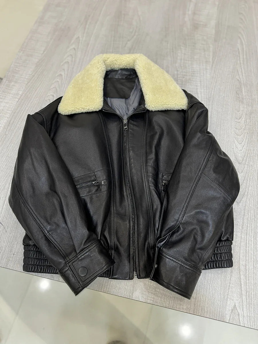 Real sheepskin leather jacket in layer meets winter warmth with a soft wool collar and goose down lining. this women leather jacket delivers a clean zip front, chest zip pockets, and a gathered bomber waist. wear it as a women bomber leather jacket or aviator leather jacket look. for cold days, it fits the search terms womens leather jacket fur and fur leather jacket for women.
