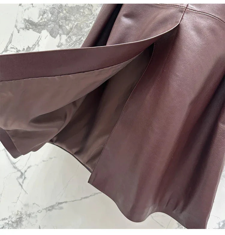 Women sheepskin leather trench coat long belt