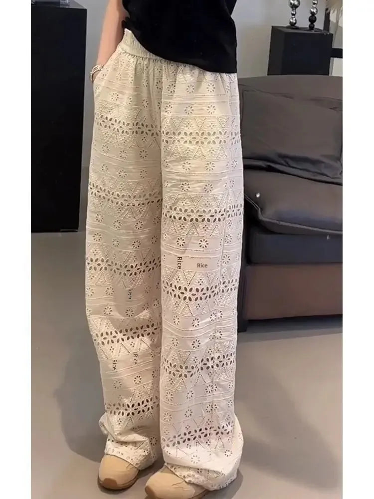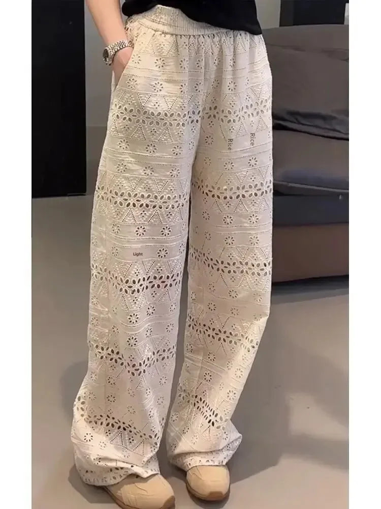 Step into summer with these light lace trousers designed to keep you cool from morning walks to late afternoon outings. The breezy floor-length cut and relaxed wide leg make them a go-to choice for women summer trousers that combine comfort with detail. The high waist fit flatters the silhouette, while the airy fabric offers a breathable option for all-day wear. Whether you're heading to the beach or strolling through town, these women beach pants are made for movement and ease.