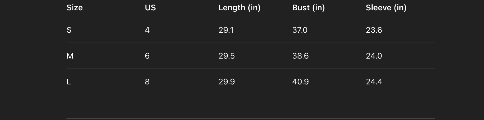 • Hip length cut works well with trousers, skirts, leggings, and denim looks