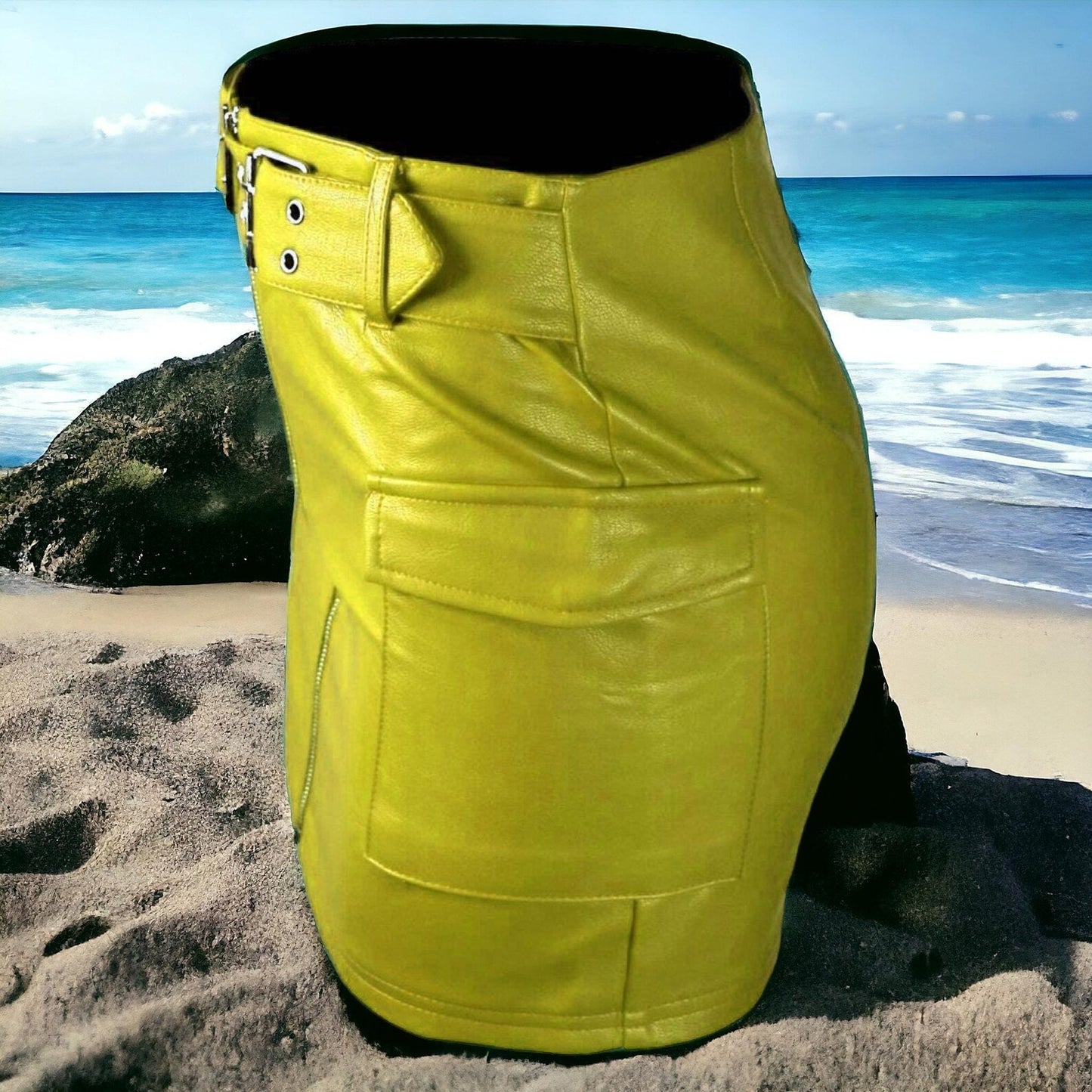 The bold belt with a double-buckle design adds character and adjustability, while the structured pockets make this short leather skirt both trendy and functional. Its genuine lambskin leather material gives a sleek and high-quality finish that is both durable and comfortable. Pair it with a fitted blouse or a casual crop top for a standout look.