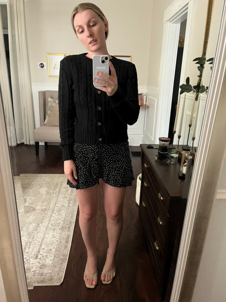 Crafted from 100% polyester with a soft, non-stretch knit texture, it feels light on the body but offers just the right amount of coziness. The long sleeves and midweight feel make it a solid pick for spring or fall weather. Pair it with boots or sneakers, layer it over a tee, or wear it closed as a standalone top.