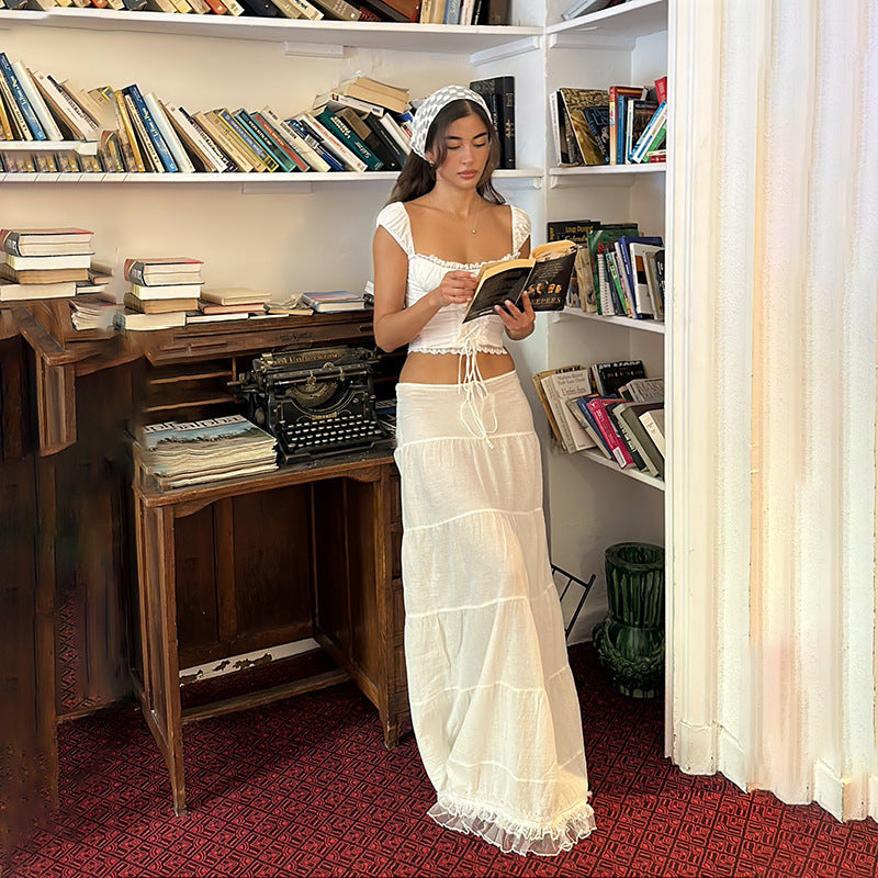 A women's ruffle skirt is easy to pair with a variety of tops. A fitted blouse adds contrast to the flowing silhouette, while a loose, tucked-in tee creates a relaxed yet polished look. For cooler days, layering with a cozy sweater maintains the charm of the ruffled maxi skirt while keeping warmth in mind.