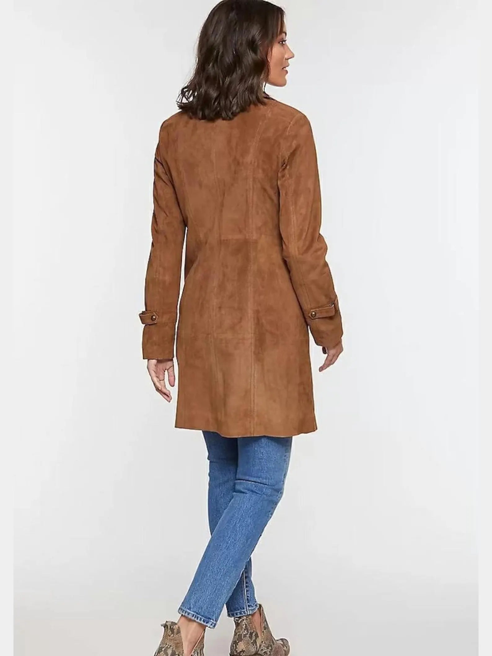 Women's Brown Suede Long Coat – Classic Mid-Thigh Leather Trench Jacket
