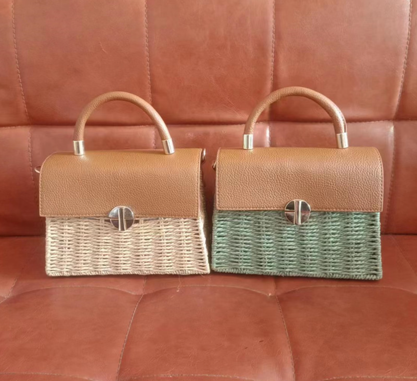- Hand-woven straw bag with leather top handle for a refined summer look