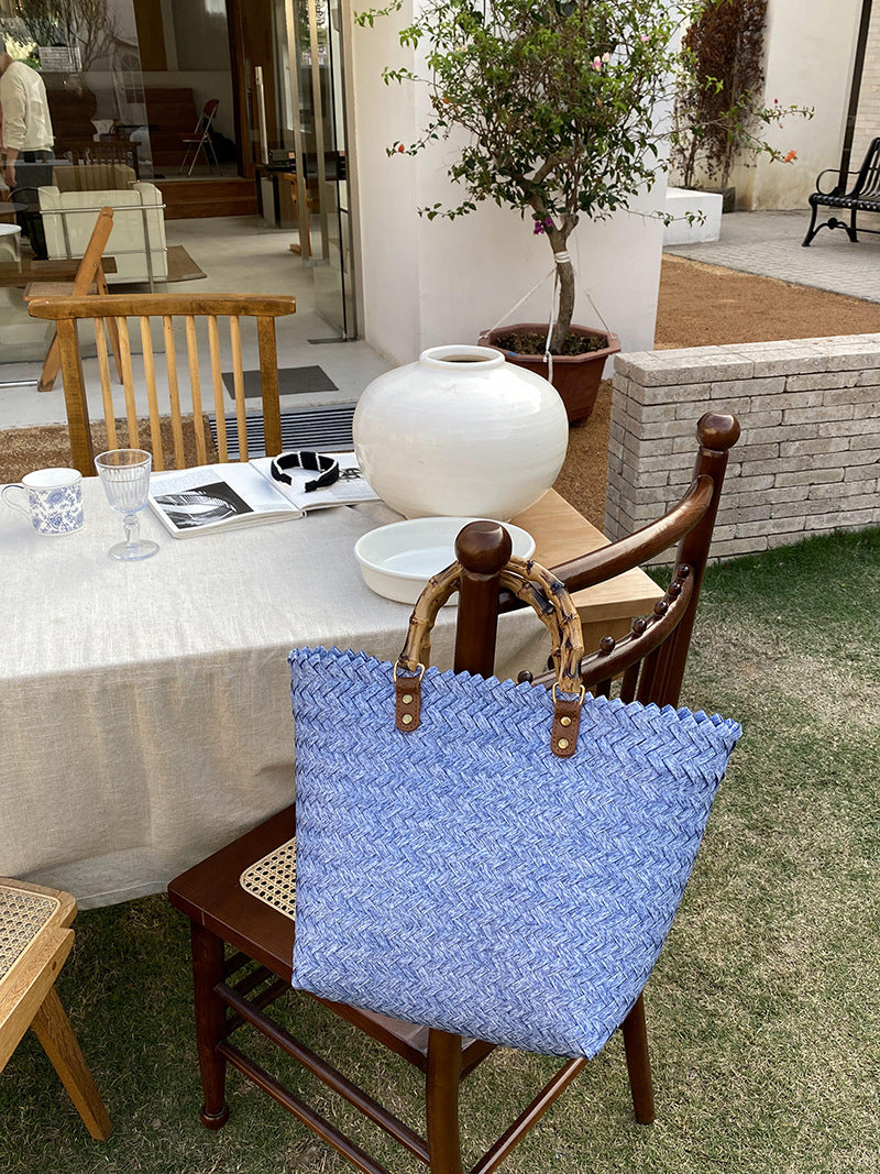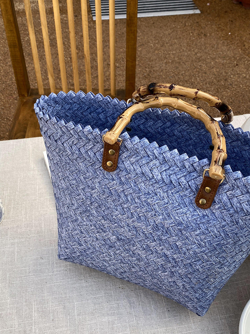 - Handwoven rattan bag with tight basket weave pattern for tropical aesthetics